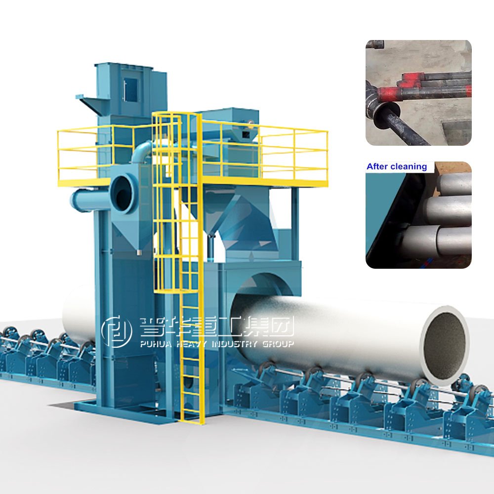 The equipment adopts a vertical or horizontal structure design, flexibly configured according to the steel pipe specifications and processing requirements. The core system includes an outer shot blasting chamber, an inner shot blasting boom system, a shot circulation system, a dust removal system, and an automated control system. During operation, the steel pipe rotates uniformly on the drive roller conveyor. The outer wall is cleaned from all angles by multiple shot blasters, while the inner wall is continuously cleaned by a retractable boom device.