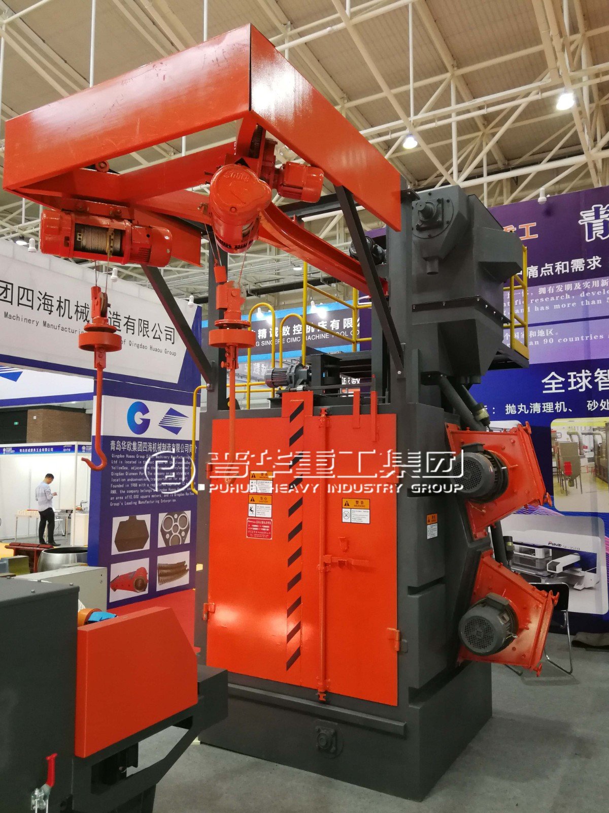 2). Workpieces can be transported continuously. The working procedure is that, setting the speed, hanging workpieces over the hooks, and removing them after shot cleaning.